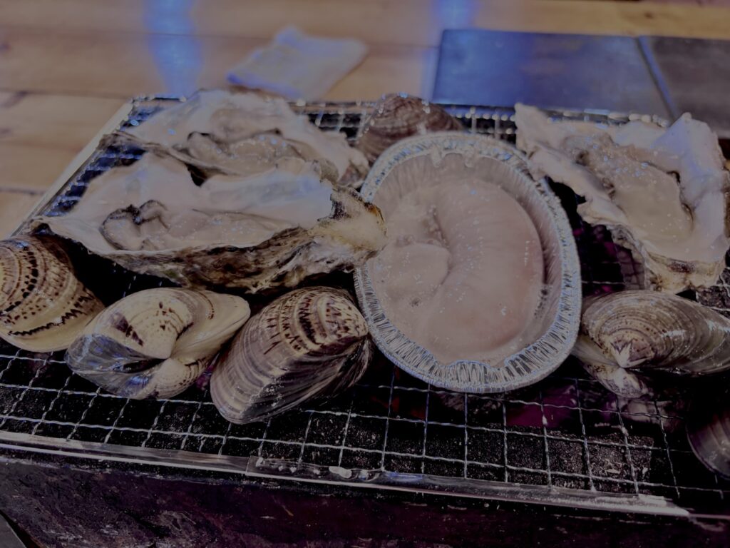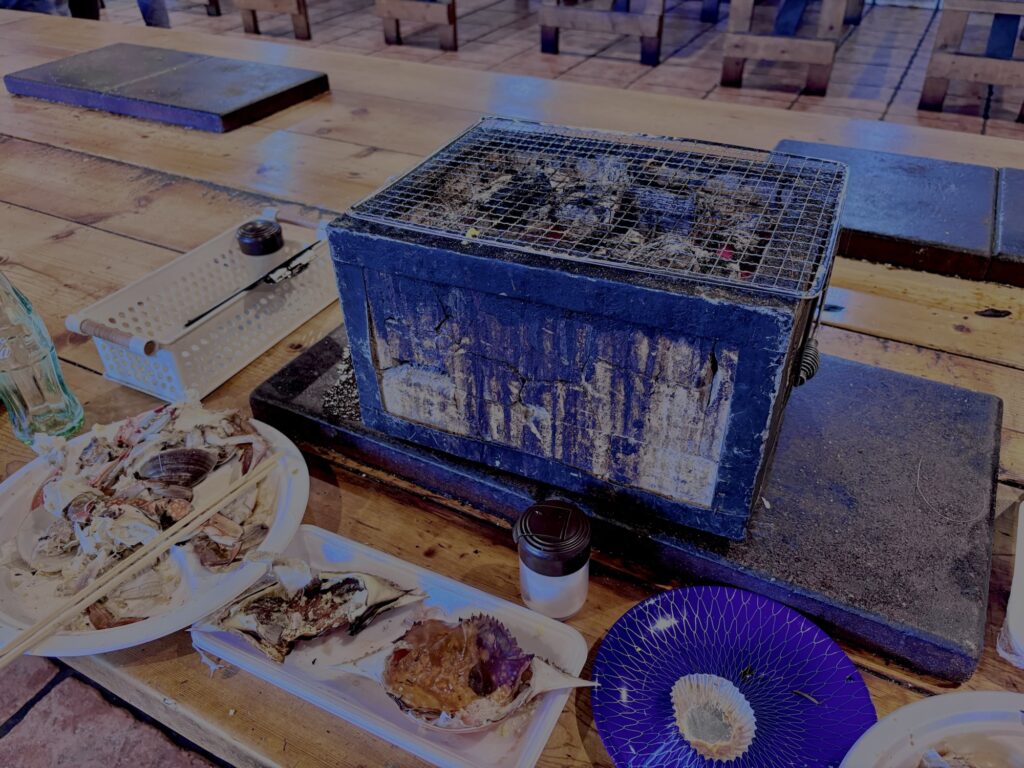 さぁそして一人500円払うと七輪と炭火で浜焼き的なのができます。