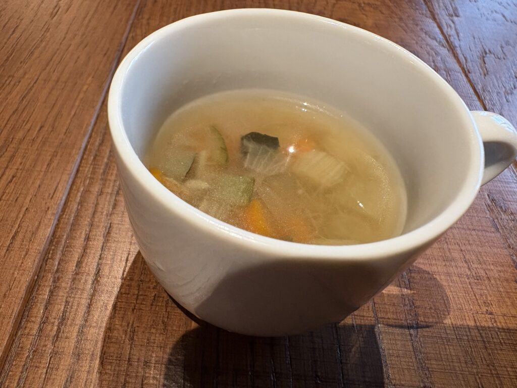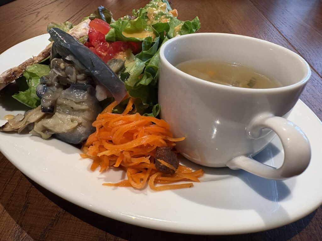 スープと肉とサラダと茄子のなにかとニンジンサラダ。