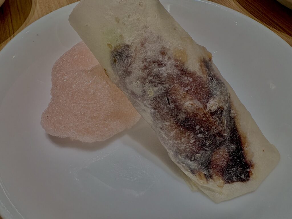 えびせんが一緒についているが、北京ダックを一口食べた後えびせんをかじり口の中で混ぜ合わせると美味しい。中華でなく東南アジアのプレートご飯のように口の中で混ざり合う刺激。