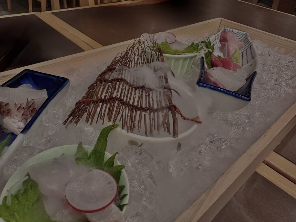 刺身はデカい箱で現れる。